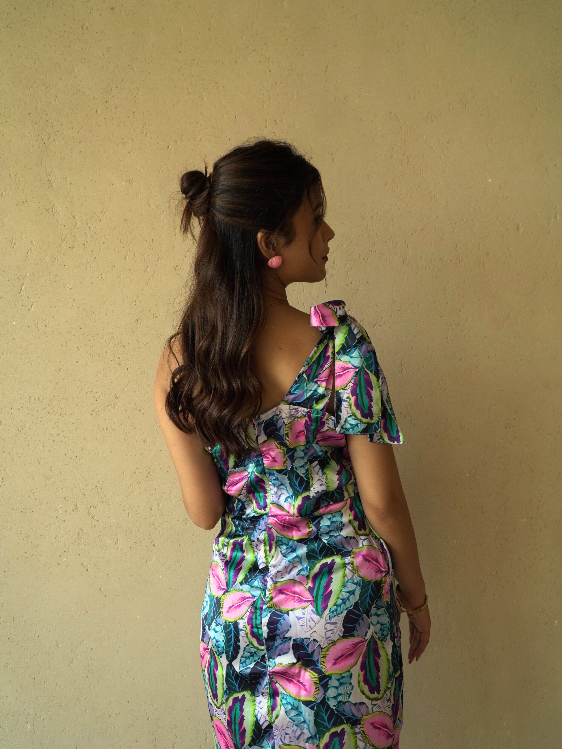 Turn heads and own the spotlight with our Floral Satin Dress, crafted in luxuriously smooth poly satin. This one-shoulder stunner features a vivid floral print in rich pinks, purples, and greens—perfect for both tropical escapes and glamorous evenings.