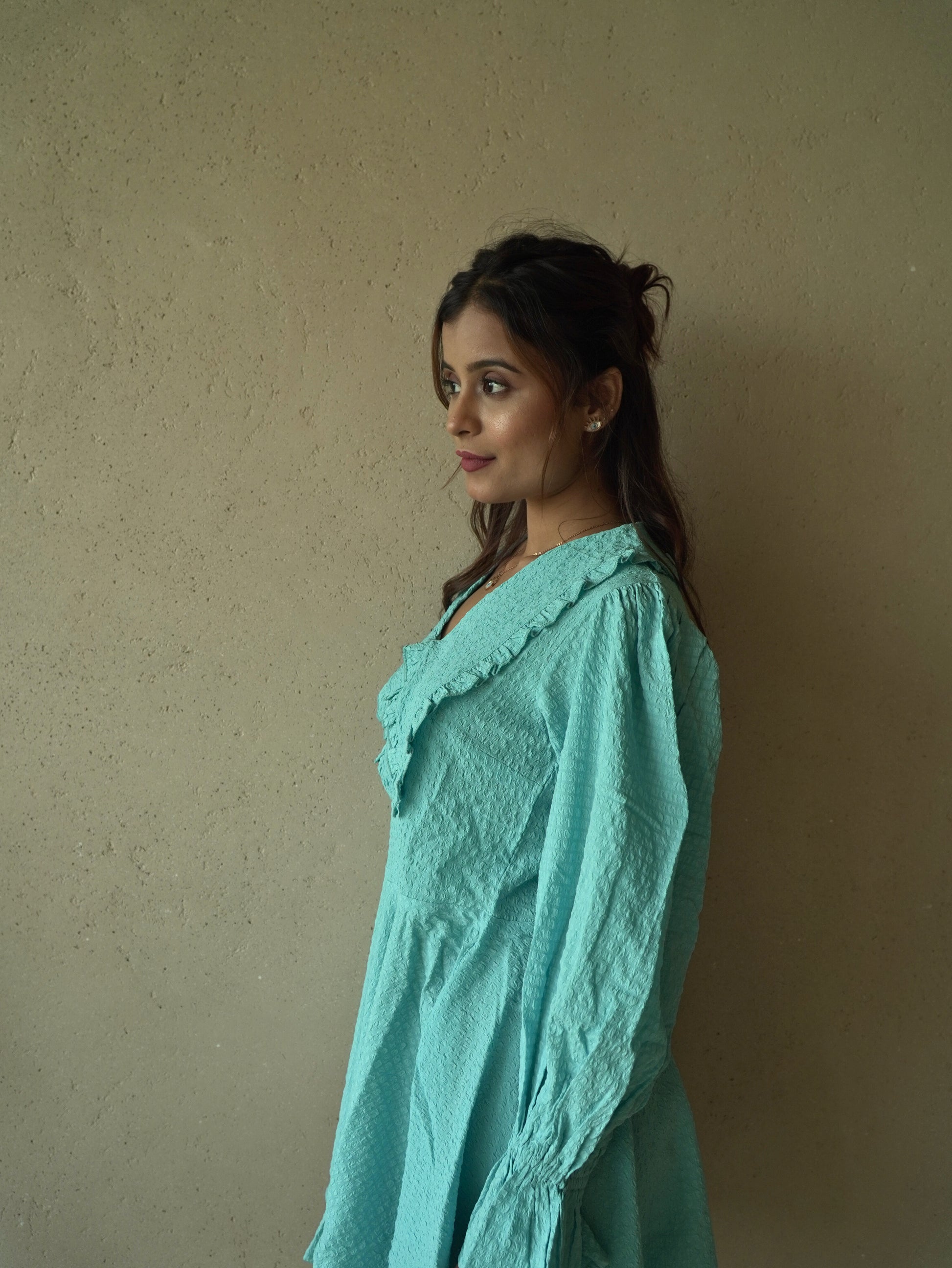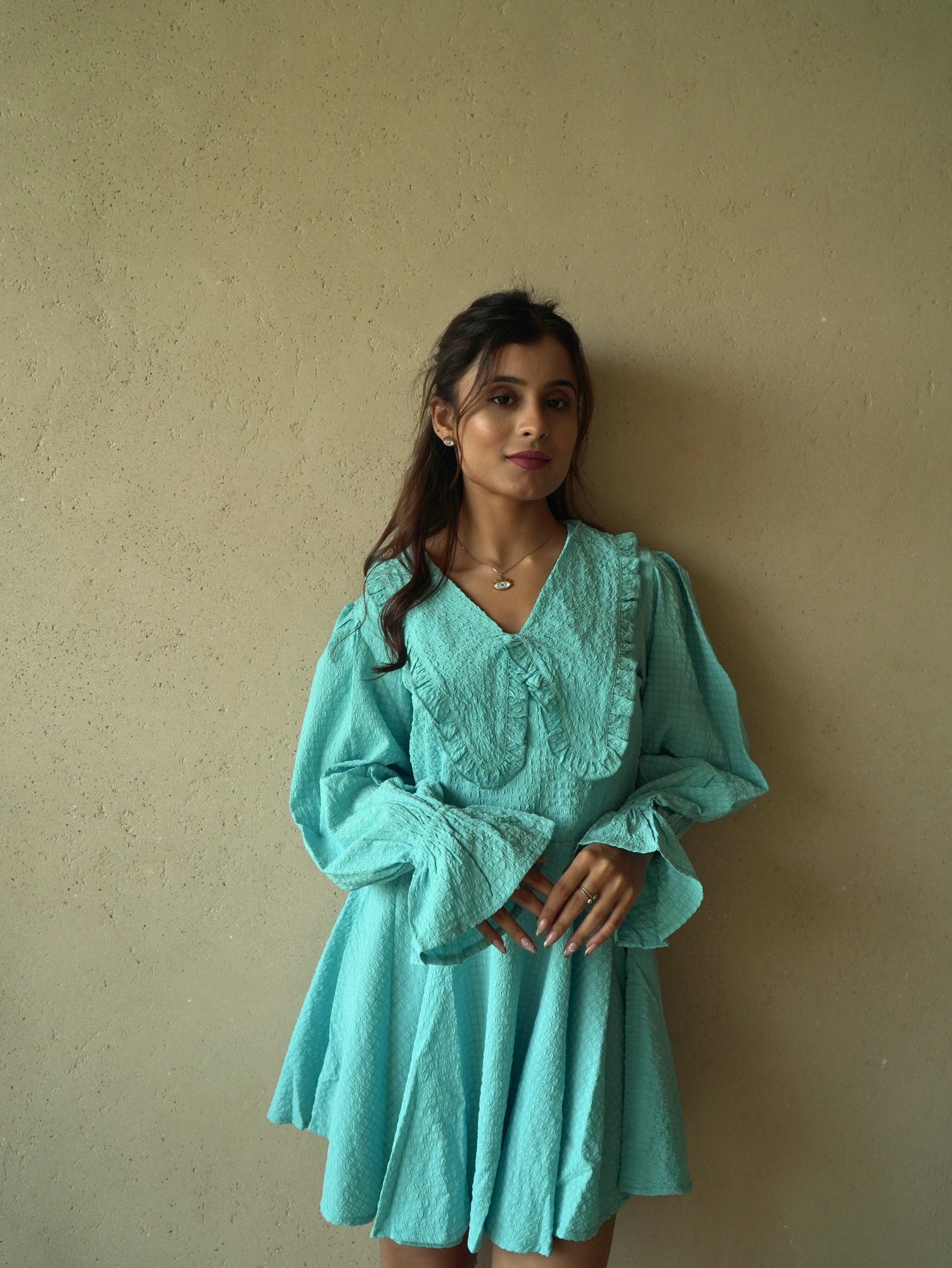 Add a splash of joy to your wardrobe with our French Blue mini dress. Made from soft, lightweight poly seersucker, this dress brings texture, elegance, and playful movement together in one stunning piece. The delicate ruffled V-neckline and statement sleeves exude a romantic charm, while the flared skirt adds that perfect twirl factor.